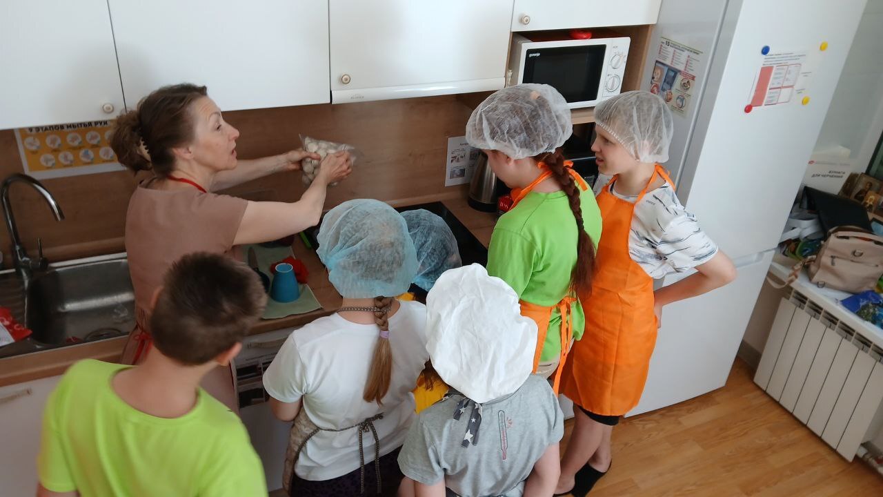Они отлично справляются: учатся запоминать алгоритм работы на кухни, готовят в шапочках и фартуках.